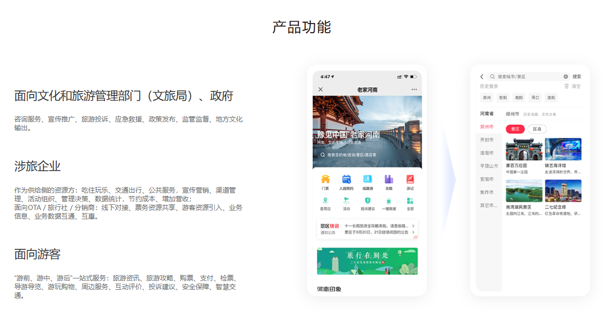 全域旅游服务平台是智慧旅游在“互联网+”时代的创新发展。通过区域内旅游景点、旅行社、酒店、旅游商品等商家的入驻,平台整合区所有吃、住、行、游、乐、购等优质资源,游客借助互联网即可获得相关旅游相关信息、服务信息和配套资源的情况,科学规划行程,享受服务。旅游企业和主管部门由此实现整合营销、整合服务和统一管理。